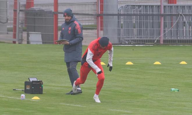 当球队、教练和工作人员仍在从德国杯1/8决赛客场3-2战胜柏林联合的途中时,穆西亚拉正在慕尼黑的训练基地单独训练。拜仁团队于周四11:49和11:53乘坐两架私人飞机降落在位于慕尼黑西侧的奥伯法芬霍芬,之后全队乘两辆大巴前往28公里外的塞本纳大街。